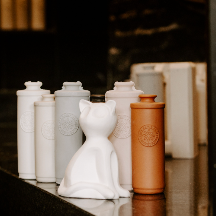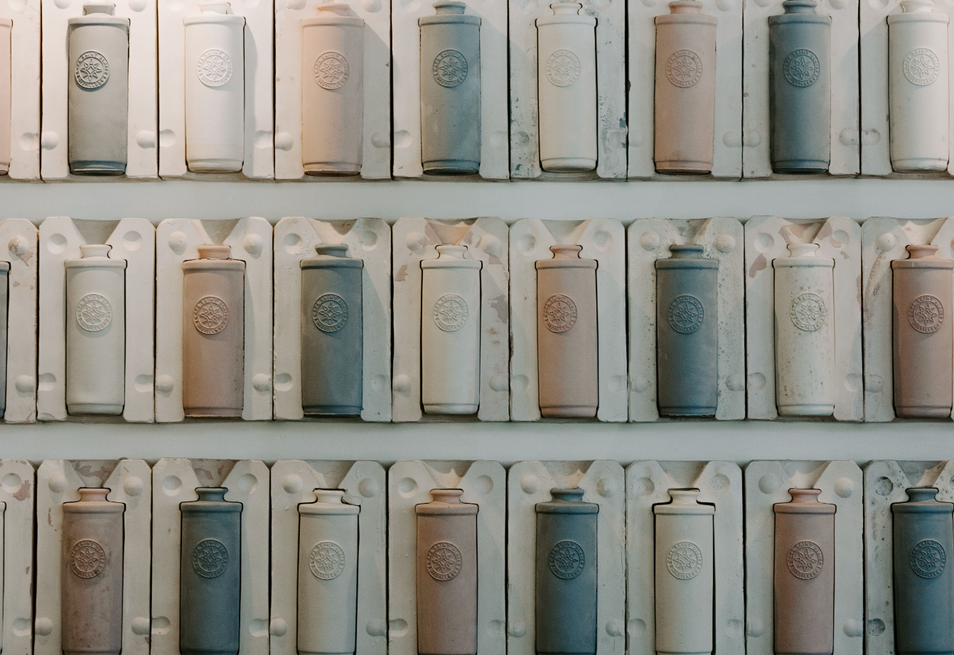 Our bottles are fired in our kilns to temperatures exceeding 1000°c for vitrification. This process takes 24 hours. On top of our kilns, there is a statue of a cat. That's Lighthouse, our Kiln protector. Since ancient Egypt and China, civilisations have had kiln deities safeguarding their wares, and we have continued this tradition.